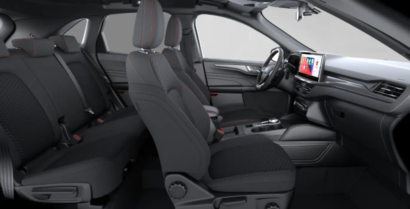 - Asientos deportivos con tapicería en tela y costuras rojas